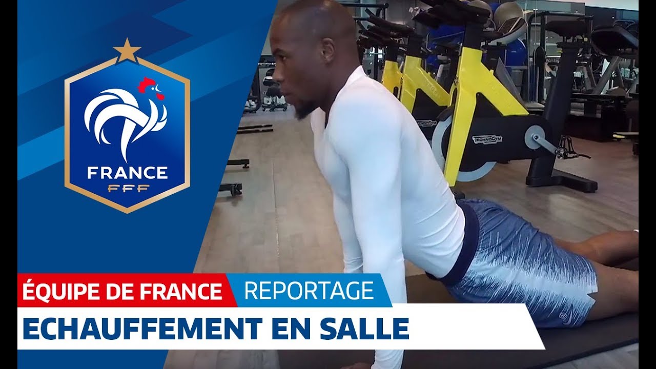 Images exclusives des Bleus de Didier Deschamps en salle d'échauffement à Clairefontaine avant le dernier entraînement. La préparation de France-Colombie vendredi au Stade de France continue.